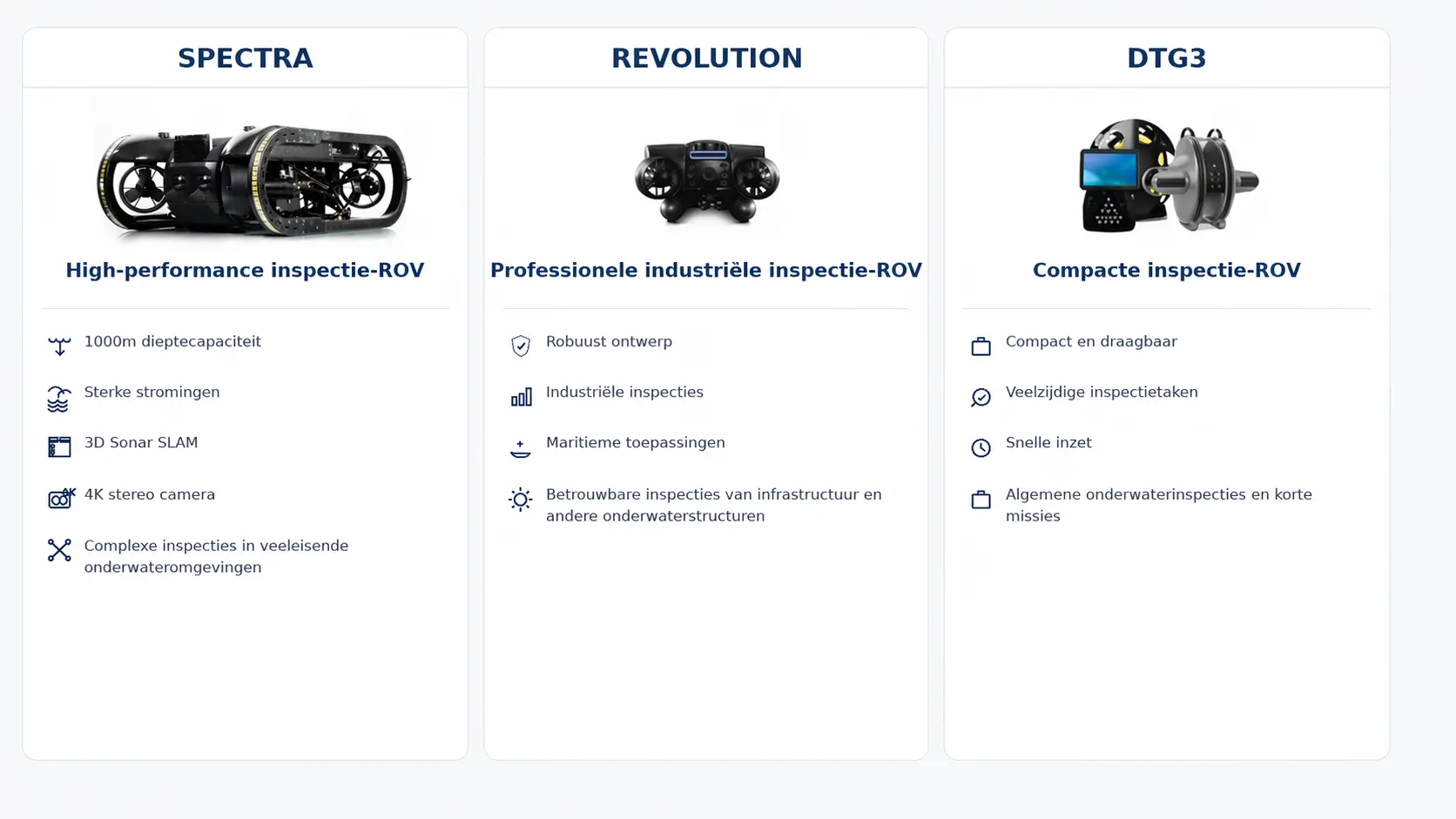Door de combinatie van stabiele prestaties, robuuste constructie en efficiënt onderhoud biedt de Deep Trekker SPECTRA een betrouwbare oplossing voor organisaties die afhankelijk zijn van hoogwaardige technologie voor professionele ROV-inspecties en onderwaterinspecties.
