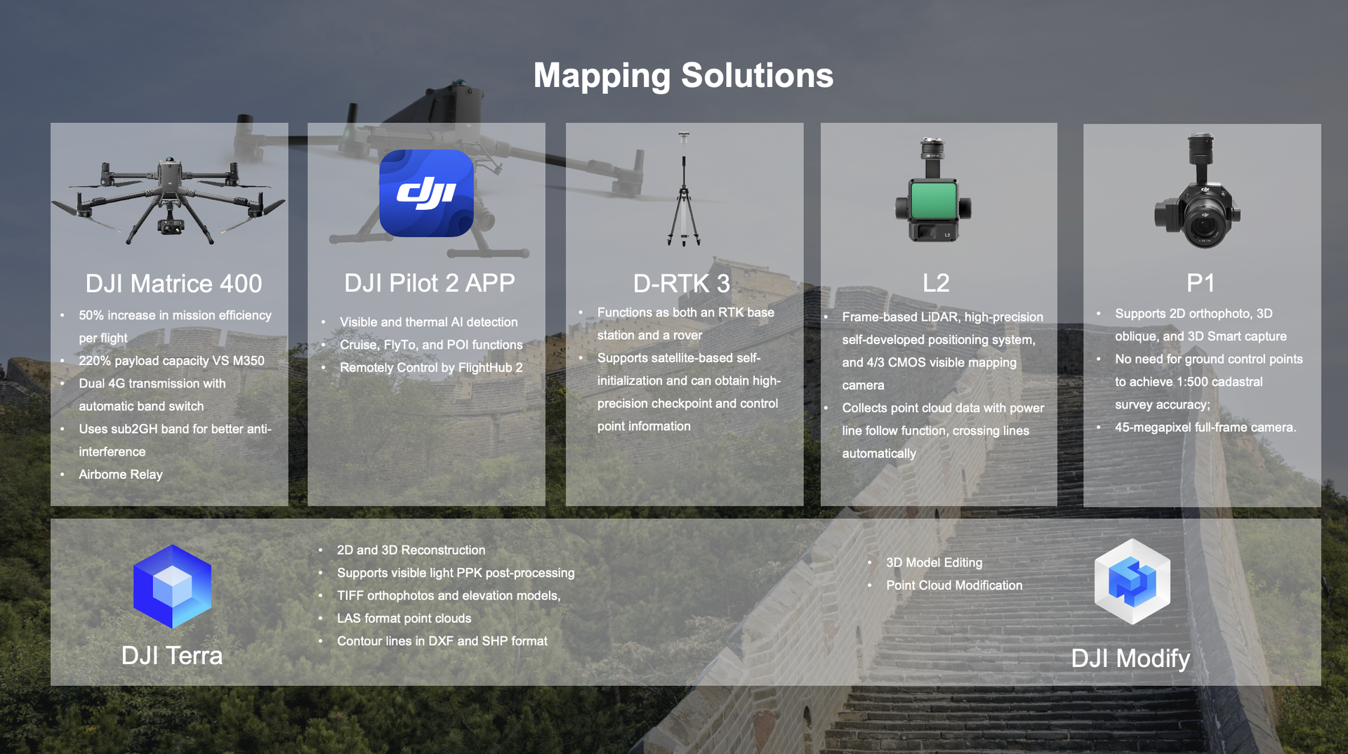 - Zenmuse L3: Biedt DJI-vluchtsystemen nauwkeurige, efficiënte en betrouwbare georuimtelijke data via frame-gebaseerde LiDAR, een zelfontwikkeld IMU-systeem met hoge precisie, en een 4/3 CMOS RGB-mappingcamera.