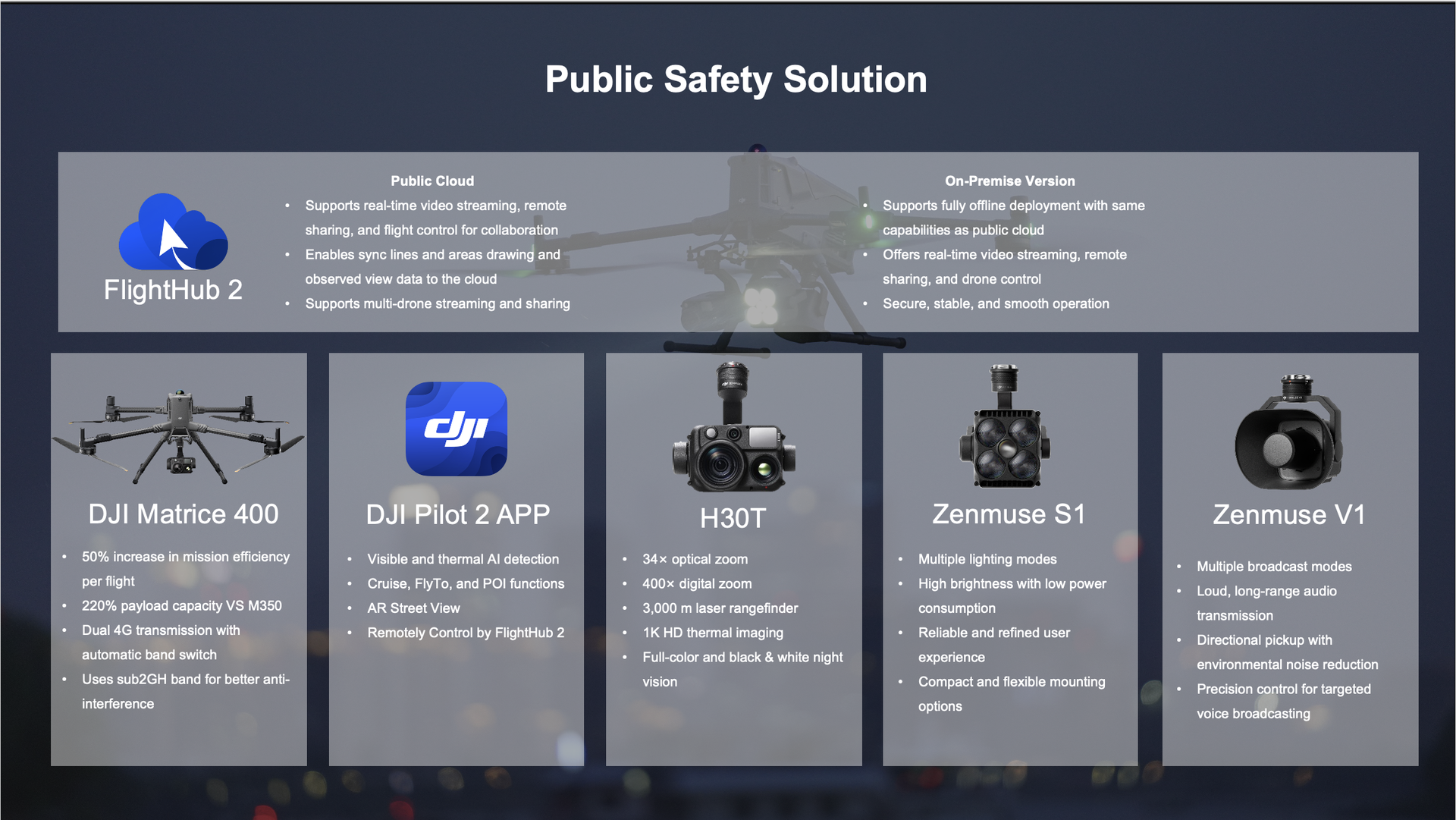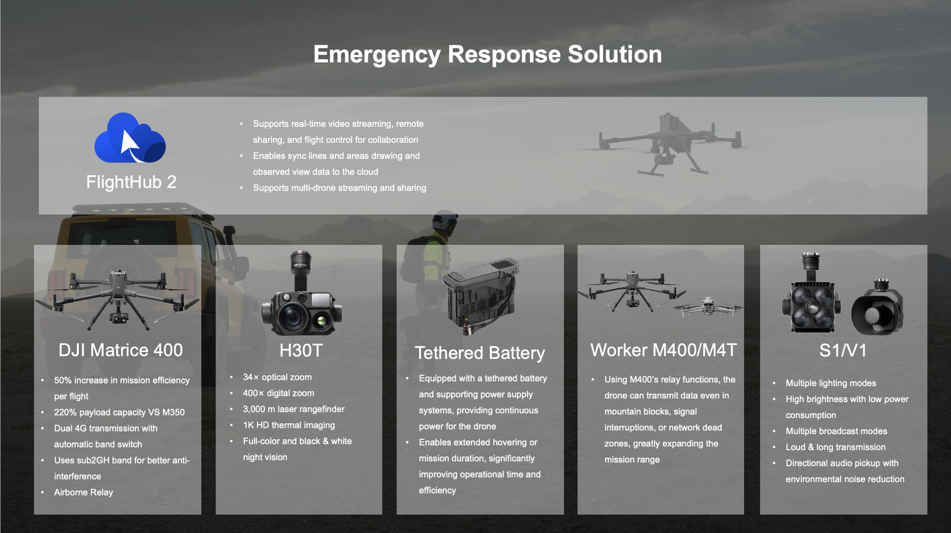 De Matrice 400 verbetert accessoires voor meer efficiënte en aanpasbare operaties. De DJI AL1 SpotLight kan onderwerpen duidelijk verlichten, zelfs vanaf 100 meter afstand, en ondersteunt zowel continu- als stroboscoopmodi. Het biedt ook verbeterde dekking in groothoekmodi. Ondertussen levert de DJI AS1 Speaker krachtig geluid, met uitzendingen tot 300 meter en een bereik van 114 decibel op 1 meter.